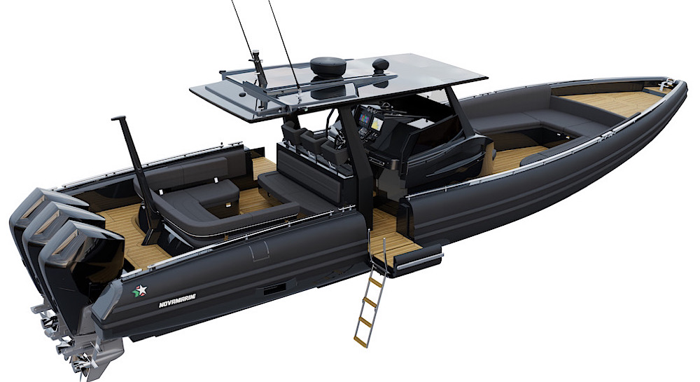 New Black Shiver 120, in build and available for April 2025. Fitted with triple 400hp Mercury V10 outboards.