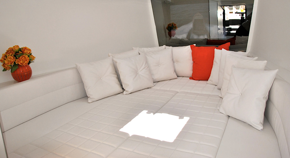 WHITE HULL AND DECK; WHITE UPHOLSTERY WITH BLACK PIPING
